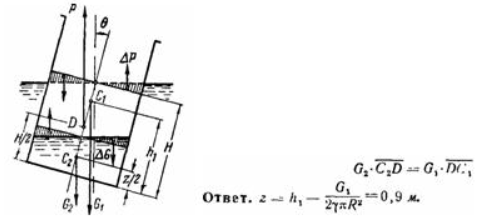 Задача (Куколевский И.И.) 3-32. Тонкостенный цилиндрический сосуд радиусом R = 0,8 м и весом m1 = 2,4 т с центром тяжести, расположенным на расстоянии h1= 1,5 м от дна, плавает в воде. Определить, какова должна быть минимальная высота г слоя воды, залитой внутрь сосуда, чтобы он обладал статической устойчивостью. Указание. При отклонении оси плавания сосуда от вертикали на малый угол 6 на сосуд действуют (см. рис. к решению задачи): 1) сила его веса G1 сила веса залитой в него воды Ог и выталкивающая сила Р = G1 + m2, проходящие соответственно через центр тяжести сосуда С1, центр тяжести залитой воды С2 и центр водоизмещения сосуда D (точки С1 и D отвечают вертикальному положению сосуда);