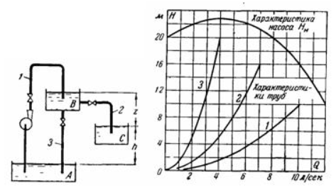 Задача (Куколевский И.И.) 14-37. Центробежный насос перекачивает воду из бака А по трубе 1 в промежуточный бак В, откуда она самотеком поступает в бак С по трубе 2 и частично возвращается в бак С по сбросной трубе 3. Характеристики насоса и труб заданы (см. график).