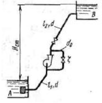 Задача (Куколевский И.И.) 14-39. Центробежный насос, подающий воду из бака А в бак В на высоту Hст = 30 м, снабжен обводной трубой, по которой часть его подачи возвращается на сторону всасывания.