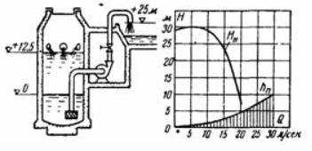 Задача (Куколевский И.И.) 14-40. Для откачки воды из дренажного колодца с притоком от Q = 5 л/с до Q = 30 л/с установлены центробежные насосы, характеристика каждого из которых задана. Насосы имеют общую всасывающую и нагнетательные линии, кривая суммарных потерь для которых указана на графике.