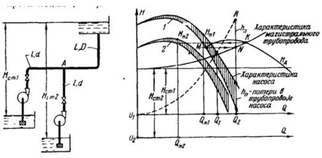 Задача (Куколевский И.И.) 14-41. Два одинаковых центробежных насоса работают совместно на магистральный трубопровод длиной L = 1000 м, диаметром D = 450 мм при различных значениях статического напора: Hст1 = 20 м и Hст2 = 30 м. Трубопроводы насосов (смыкающиеся в узле А) имеют одинаковые длины l = 100 м и одинаковые диаметры d = 300 мм.