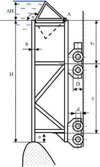 3) Какое необходимо усилие, чтобы стронуть затвор с поднятым клапаном? Собственный вес затвора G=150 т; внешний диаметр катков D=0,6 м; коэффициент трения качения k=0,01 см; диаметр цапф d=0,3 м; коэффициент трения скольжения в цапфах f=0,15; b=0,1 м; угол α=120°.