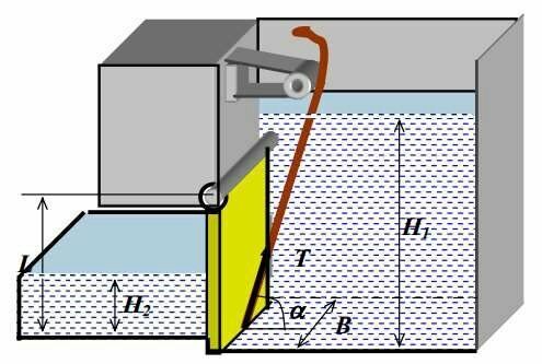 Задача 10. Прямоугольный поворотный щит размером L×B закрывает выпускное отверстие резервуара с жидкостью. Справа от щита уровень жидкости H1, слева – H2. Щит открывается с помощью троса, перекинутого через неподвижный блок. Температура жидкости t °C.