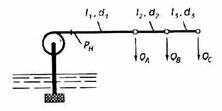 Задача (Куколевский И.И.) 10.36. Определить, какое давление нагнетания рн должен создавать насос, перекачивающий воду по горизонтальному трубопроводу, состоящему из трех последовательных участков размерами l1 = 400 м, d1 = 200 мм; l2 = 200 м, d2 = 150 мм; l3 = 200 м, d3 = 100 мм, если в конечных сечениях участков из трубопровода отбираются одинаковые расходы QA = QC = 10 л/с и минимальный пьезометрический напор в конце трубопровода должен равняться Нс = 5м столба воды. Все участки трубопровода имеют одинаковую шероховатость ? = 0,5 мм. Ответ. Pи = 142 кПа..