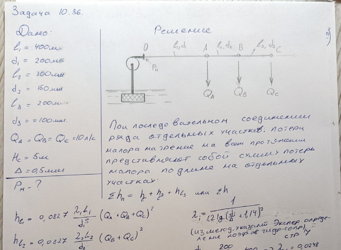 Задача (Куколевский И.И.) 10.36. Определить, какое давление нагнетания рн должен создавать насос, перекачивающий воду по горизонтальному трубопроводу, состоящему из трех последовательных участков размерами l1 = 400 м, d1 = 200 мм; l2 = 200 м, d2 = 150 мм; l3 = 200 м, d3 = 100 мм, если в конечных сечениях участков из трубопровода отбираются одинаковые расходы QA = QC = 10 л/с и минимальный пьезометрический напор в конце трубопровода должен равняться Нс = 5м столба воды. Все участки трубопровода имеют одинаковую шероховатость ? = 0,5 мм.