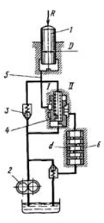 Задача (Куколевский И.И.) 14.52. Плунжер 1, имеющий диаметр D = 120 мм, должен совершать возвратно-поступательное движение, находясь под нагрузкой R = 35 000 Н. Подъем плунжера осуществляется жидкостью, подаваемой в цилиндр шестеренным насосом 2 через обратный клапан 3. Перепад давлений, возникающий на клапане 3, поднимает золотник 4 в положение 1, перекрывая линию слива 5 из полости цилиндра. При выключении насоса давление, создаваемое плунжером под нагрузкой, смещает золотник 4 в положение II, открывая путь слива жидкости через диафрагменный дроссель 6. При этом скорость опускания плунжера определяется сопротивлением дросселя 6. 1. Определить скорость подъема плунжера я давление, развиваемое при этом насосом, если подача насоса Qн = 600 см3/с, а потеря давления в клапане 3 ?P = 0,2 МПа. Сопротивлением напорных линий пренебречь. Линия слива 5 пересекается с линией, идущей от клапана 3 к золотнику 4. 2) Выбрать число дроссельных шайб i так, чтобы скорость опускания плунжера была равна скорости его подъема. Диаметр отверстий в шайбах d = 6 мм, коэффициент расхода отверстий принять ? = 0,64. Плотность жидкости р = 910 кг/м3. Сопротивлением сливных труб и золотника пренебречь.