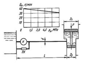 Задача (Куколевский И.И.) 14.54. Объемный насос, характеристика которого приведена на рисунке, подает масло (р = 865 кг/м3, вязкость v = 70 сСт) по горизонтальной трубе длиной l = 20 м и диаметром d= 10 мм в цилиндр с дифференциальным поршнем, диаметры которого D1 = 150мми D2= 120мм. Предохранительный клапан ПК отрегулирован на давление открытия 5 МПа. Определить скорость поршня г)Г| и развиваемое насосом давление рк в двух случаях: при нагрузке на поршень Р = 12,7 кН и при нагрузке Р = 0.