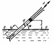 Задача (Куколевский И.И.) 12-1. В наклонной трубе (а = 45°), диаметр которой d = 60 мм, движется, увлекая за собой воду, поршень с постоянным ускорением j = 0,5 м/с2. Длина погруженной части трубы l0 = 2 м. Определить, на какой высоте zмакс над уровнем произойдет отрыв воды от поршня, если в начальный момент движения (при t=0 и z = 0) скорость поршня v = 0 и если наибольшая допустимая при заданной температуре воды вакууметрическая высота всасывания равна 8м.