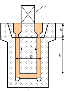 Определить минимальную силу тяжести груза G, который при заливке формы чугуном нужно положить на верхний стержень, чтобы предотвратить его всплывание. Вес стержней с учетом веса чугуна в литнике и выпоре G1 = 50 Н. Плотность жидкого чугуна ρ = 7000 кг/м3; размеры: H = 200 мм; D = 140 мм; h = 80 мм; d = 120 мм.