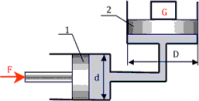 Для студентов по предмету Механика жидкости и газа (МЖГ или Гидравлика)Определить давление в гидросистеме и вес груза G, лежащего на поршне 2, если для его подъема к поршню 1 приложена сила F = 1,8 кН. Диаметры поршней: DОпределить давление в гидросистеме и вес груза G, лежащего на поршне 2, если для его подъема к поршню 1 приложена сила F = 1,8 кН. Диаметры поршней: D