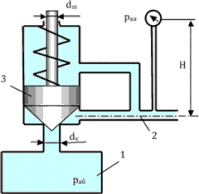 Определить абсолютное давление в резервуаре 1, если подача жидкости из него по трубопроводу 2 прекратилась и клапан 3 закрылся. Показание вакуумметра, pвак = 0,05 МПа, высота H = 2,5 м, сила пружины Fпр = 10 Н, плотность жидкости ρ = 800 кг/м3, атмосферное давление соответствует hа = 755 мм рт. ст., диаметры dкл = 20 мм, dш = 10 мм. Вертикальными размерами клапана 3 пренебречь.