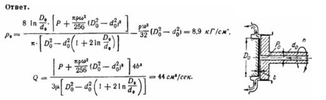 Задача (Куколевский И.И.) 8-22. Гидравлическая пята, число оборотов которой равно n = 600 об/мин, воспринимает нагрузку, равную P = 400 Н. Определить: 1) Давление, P0, которое необходимо создать в центральном канале диаметром d=12 мм, если наружный диаметр пяты D0 = 45 мм. 2) Чему равен расход жидкости через торцовый зазор пягы, если величина зазора b = 0,2 мм, вязкость масла равна м=0,64 П и его удельный вес у = 900 кГ/м3. Указание. При определении давления, вызванного полем центробежных сил, принять угловую скорость вращения жидкости равной половине угловой скорости вращения диска пяты.