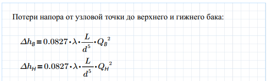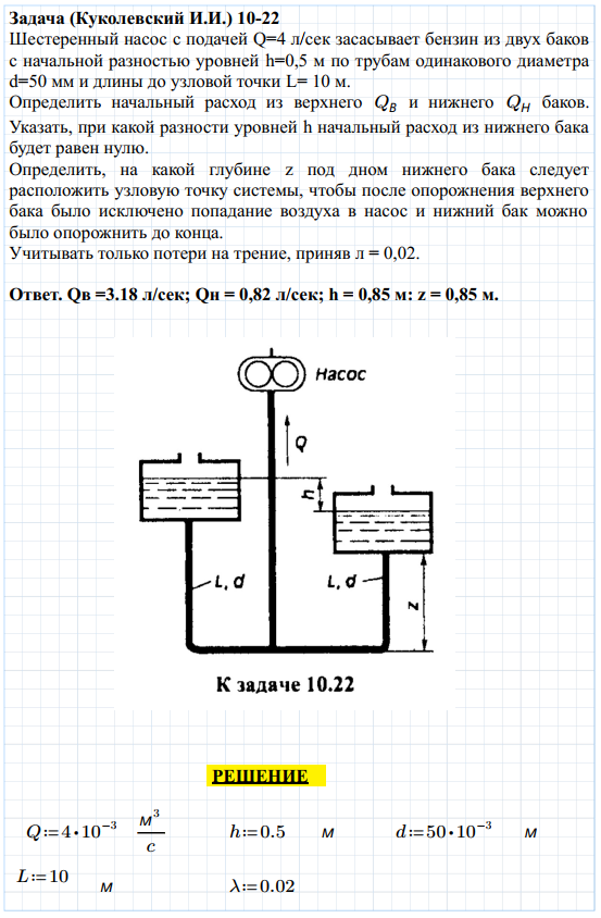 Шестеренный насос с подачей Q=4 л/сек засасывает бензин из двух баков с начальной разностью уровней h=0,5 м по трубам одинакового диаметра d=50 мм и длины до узловой точки L= 10 м.  Определить начальный расход из верхнего   и нижнего   баков. Указать, при какой разности уровней h начальный расход из нижнего бака будет равен нулю. Определить, на какой глубине z под дном нижнего бака следует расположить узловую точку системы, чтобы после опорожнения верхнего бака было исключено попадание воздуха в насос и нижний бак можно было опорожнить до конца. Учитывать только потери на трение, приняв л = 0,02. Ответ. Qв =3.18 л/сек; Qн = 0,82 л/сек; h = 0,85 м: z = 0,85 м..