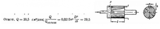 Задача (Куколевский И.И.) 8-14. В цилиндр диаметром D = 25 мм помещен поршень с четырьмя прорезями прямоугольного сечения (s*b). Пренебрегая потерями на входе, определить расход масла вязкостью 1,5 П по четырем прорезям из левой полости цилиндра, избыточное давление в которой равно р=200 кПа, в правую, где давление равно атмосферному. Результат сравнить с расходом через кольцевую щель той же площади. Размеры прорези: S = 3 мм, b = 1,5 мм, l=150 мм.