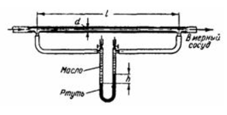 Задача (Куколевский И.И.) 8-34. Дай определения вязкости масла измеряется потеря напора при его прокачке через калиброванную трубку диаметром d = 6 мм. Каково значение динамического коэффициента вязкости масла, если при расходе (Q = 7,3 см3/сек показание ртутного дифманометра, подключенного к участку трубки длиной l = 2 м, равно h= 120 мм. Удельный вес масла у = 900 кГ/м3.