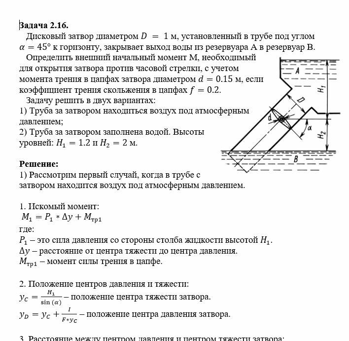 Задача (Куколевский И.И.) 2-16 . Дисковый загвор диаметром D=1 м, установленный в трубе под углом а = 45° к горизонту, закрывает выход воды из резервуара А в резервуар В. Определить величину внешнего начального момента М, необходимого для открытия затвора против часовой стрелки, с учетом момента трения в цапфах затвора диаметром d = 0,15 м, если коэффициент трения f = 0,2. Задачу решить для двух случаев: 1) в трубе за затвором воздух под атмосферным давлением; 2) труба за затвором заполнена водой. Высоты уровней: H 1 =1,2 м и Н 2 = 2 м. Ответ. M 1 = 480 кН*м; М 2 = 370 кН*м..