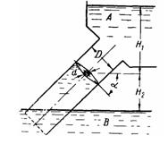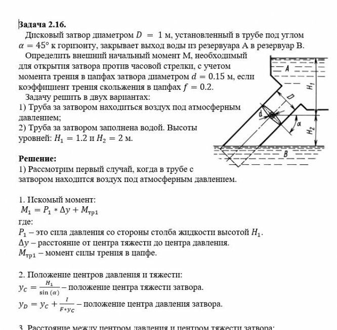 Задача (Куколевский И.И.) 2-16 . Дисковый загвор диаметром D=1 м, установленный в трубе под углом а = 45° к горизонту, закрывает выход воды из резервуара А в резервуар В. Определить величину внешнего начального момента М, необходимого для открытия затвора против часовой стрелки, с учетом момента трения в цапфах затвора диаметром d = 0,15 м, если коэффициент трения f = 0,2. Задачу решить для двух случаев: 1) в трубе за затвором воздух под атмосферным давлением; 2) труба за затвором заполнена водой. Высоты уровней: H 1 =1,2 м и Н 2  = 2 м. Ответ. M 1  = 480 кН*м; М 2  = 370 кН*м..