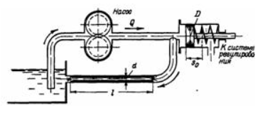 Задача (Куколевский И.И.) 8-9. В регуляторе скорости гидротурбины применен так называемый гидравлический маятник. При изменении числа оборотов регулируемой турбины изменяется расход жидкости, прокачиваемой насосом маятника через калиброванную трубку, вследствие чего изменяется сила давления на поршень, и последний, меняя поджатие пружины, оказывает воздействие на систему регулирования. Определить диаметр и калиброванной трубки так, чтобы при подаче насоса Q=0,39 л/сек (что соответствует рабочему числу оборотов турбины) сжатие пружины было S0 = 60 мм. Жесткость пружины С=0,75 кГ/см, длина трубки l = 0,7 мл вязкость масла 0,3 пз. Диаметр поршня D = 30 мм. Сопротивлением подводящих труб пренебречь,