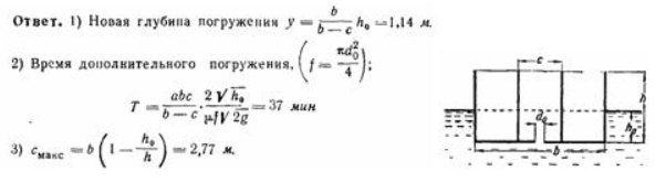 Задача (Куколевский И.И.) 11-25. Тонкостенный открытый призматический сосуд (шириной а = 2 м, длиной b = 5 м и высотой h = 1,8м), плавает в воде, погруженный на глубину h0 = 0,8 м. Сосуд снабжен двумя вертикальными тонкостенными переборками, расстояние между которыми с = 1,5 м. Рассмотреть процесс погружения сосуда после открытия в отсеке между переборками донного отверстия диаметром d0 = 40 мм (? = 0,62), определив: