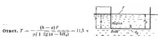 Задача (Куколевский И.И.) 11-26. Определить время затопления баржи, заполненной нефтью относительного удельного веса б=0,85 на высоту Н0 = 2 м после получения ею донной пробоины (диаметр отверстия d0 = 50 мм, м = 0,61). Размеры баржи: высота h = 3 м, площадь F=120 м2, ее начальное погружение а = 2 м. ![]()