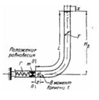 Задача (Куколевский И.И.) 12-15. Система, состоящая из пружины, поршня и жидкого столба длиной L, выведена из состояния покоя и затем совершает свободные колебания. Определить закон движения жидкости и вычислить период колебания, если масса поршня т и площадь поперечного сечения трубки f. Режим течения считать ламинарным; плотность и вязкость жидкости р. Сравнить с периодом колебаний, вычисленным в предположении отсутствия трения.