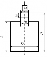 Определить модуль объёмной упругости жидкости Е, если под действием груза А массой 250 кг поршень переместился на расстояние Δh = 5 мм. Начальная высота положения поршня (без груза) H =1,5 м, диаметр поршня d = 80 мм, резервуара D = 300 мм, высота резервуара h = 1,3 м. Весом поршня можно пренебречь. Резервуар считать абсолютно жёстким.