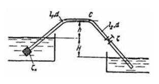 Задача (Куколевский И.И.) 9-4. По сифонному трубопроводу, для которого задан напор H = 6 м, необходимо подавать расход воды Q = 50 л/сек при условии, чтобы вакуум в трубопроводе не превосходил 7 м. Опасная точка С расположено выше начального уровня воды на h= 4 м, длина восходящей линии трубопровода до этого сечения l1=100м, а нисходящей линии l2 = 60 м. Трубопровод снабжен приемным клапаном с сеткой (?к = 5) и задвижкой. Определить диаметр трубопровода d и коэффициент сопротивления задвижки ? удовлетворяющие условиям задачи. Для коэффициента сопротивления трения воспользоваться формулой (9.21), потерями на поворотах пренебречь. Построить график напоров по длине трубопровода.
