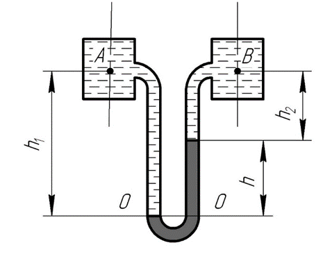 К двум резервуарам А и В, заполненным морской водой, присоединен дифференциальный ртутный манометр. Составить уравнение равновесия относительно плоскости равного давления и определить разность давлений в резервуарах А и В, если расстояния от оси резервуаров до мениска ртути равны h1=0,4 м и h2=0,2 м.