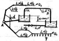 Из водоисточника А вода подается в накопительный резервуар, где поддерживается постоянный уровень. Из резервуара-накопителя вода поступает в приемный резервуар при помощи стального сифонного водопровода, имеющего углы поворота α и β. Стальной трубопровод диаметром d, отходящий от нижнего резервуара, заканчивается задвижкой. Система последовательно соединенных трубопроводов с длиной L и диаметрами d, d/2, d/3, d/4 пропускает транзитом из источника А объемный расход Q2 к потребителю. Система трубопроводов с параллельными ветвями заканчивается последовательным участком с равномерно распределенным путевым объемным расходом q.