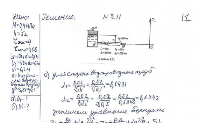 Задача (Куколевский И.И.) 9-11. Для горизонтального трубопровода, размеры которого указаны на схеме, определить расход Q при заданном давлении М = 4 атм и уровне воды в резервуаре Н = 5 м. Коэффициенты сопротивления вентиля С = 4 и сопла ? = 0,06 (сжатие струи на выходе из сопла отсутствует). Шероховатость каждого из участков трубопровода 1 мм (старые водопроводные трубы). Как изменится Q, если диаметр первого участка увеличить до d1 = 200 мм? Построить графики напоров по длине трубопровода.