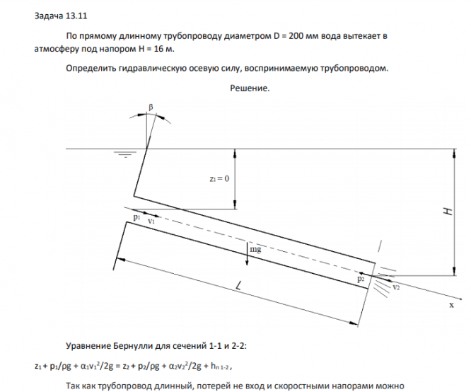​​​​ Задача 13.11 По прямому длинному трубопроводу диаметром D = 200 мм вода вытекает в атмосферу под напором H = 16 м. Определить гидравлическую осевую силу, воспринимаемую трубопроводом.