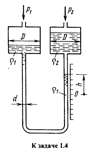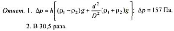 Двухжидкостный микроманометр состоит из U-образной трубки диаметром d = 5 мм, соединяющей чашки диаметрами D = 50 мм. Прибор наполнен несмешивающимися жидкостями с близкими удельными весами -водным раствором этилового спирта (ρ 1  = 870 кг/м 3 ) и керосином (ρ 2  = 830 кг/м 3 ). 1) Установить связь между измеряемой микроманометром разностью давлений газа ∆р = р 1 −р 2  и смещением h мениска раздела жидкостей от его начального положения, отвечающего р = 0. Определить р при h = 280 мм.  2) Указать, во сколько раз уменьшатся показания прибора при данном р, если в приборе будут отсутствовать чашки..