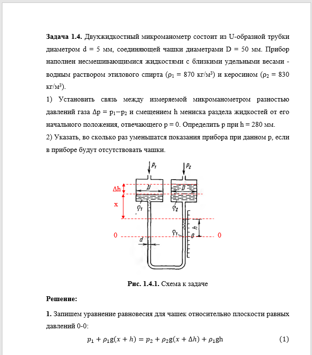 1) Установить связь между измеряемой микроманометром разностью давлений газа ∆р = р1−р2 и смещением h мениска раздела жидкостей от его начального положения, отвечающего р = 0. Определить р при h = 280 мм.