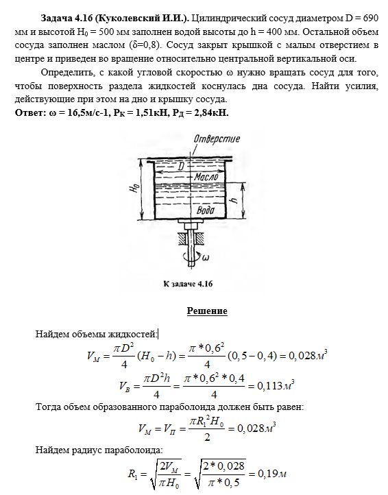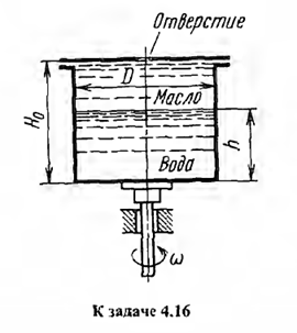 Цилиндрический сосуд диаметром D = 690 мм и высотой H 0  = 500 мм заполнен водой высоты до h = 400 мм. Остальной объем сосуда заполнен маслом (δ=0,8). Сосуд закрыт крышкой с малым отверстием в центре и приведен во вращение относительно центральной вертикальной оси. Определить, с какой угловой скоростью ω нужно вращать сосуд для того, чтобы поверхность раздела жидкостей коснулась дна сосуда. Найти усилия, действующие при этом на дно и крышку сосуда. Ответ:  ω  = 16,5м/с-1,  P К  = 1,51кН,  P Д  = 2,84кН..