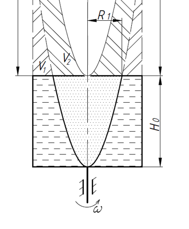 Цилиндрический сосуд диаметром D = 690 мм и высотой H0 = 500 мм заполнен водой высоты до h = 400 мм. Остальной объем сосуда заполнен маслом (δ=0,8). Сосуд закрыт крышкой с малым отверстием в центре и приведен во вращение относительно центральной вертикальной оси.