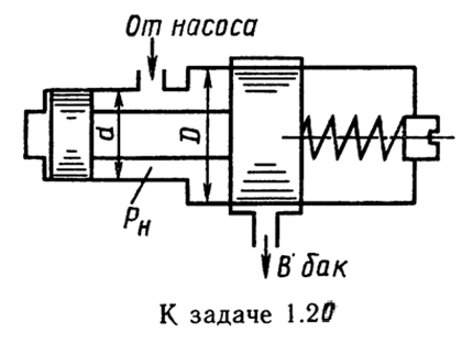 Определить величину предварительного поджатия пружины дифференциального предохранительного клапана (мм), обеспечивающую начало открытия клапана при Рн = 3 МПа. Диаметры клапана: D = 22 мм, d=20 мм; жесткость пружины с= 8 Н/мм. Давление справа от большого и слева от малого поршней — атмосферное.