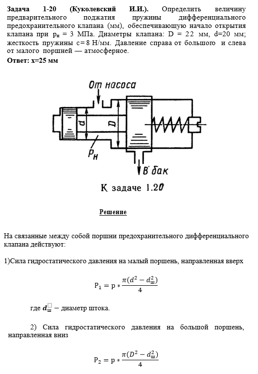Определить величину предварительного поджатия пружины дифференциального предохранительного клапана (мм), обеспечивающую начало открытия клапана при р н   = 3 МПа. Диаметры к л а п а н а :D= 22 м м ,d = 20 мм ; жесткостьп р у ж иныс= 8 Н/ мм .Да вл е ниес п р а ва от бо ль ш о го  ислева от малого поршней—атмосферное. Ответ: x= 25мм .