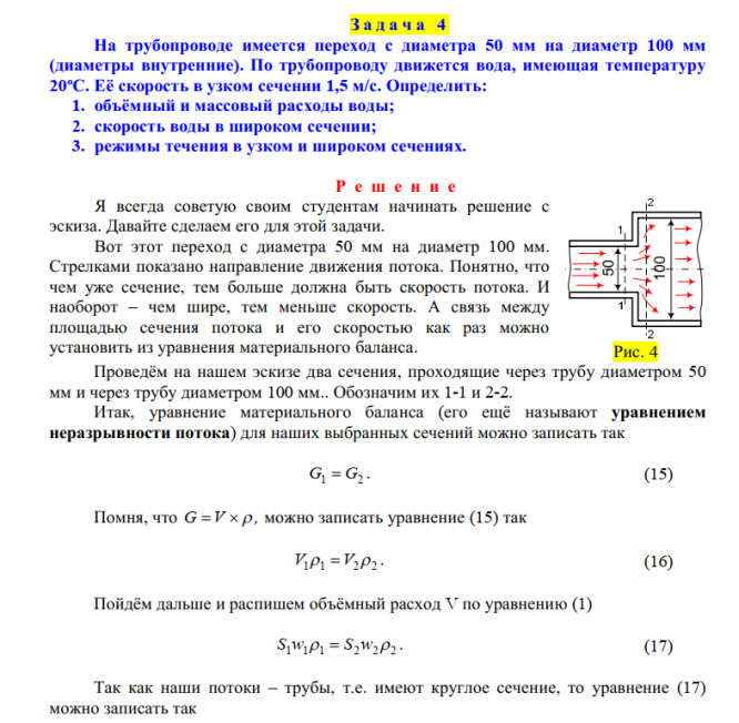 На трубопроводе имеется переход с диаметра 50 мм на диаметр 100 мм (диаметры внутренние). По трубопроводу движется вода, имеющая температуру 20ºС. Её скорость в узком сечении 1,5 м/с. Определить: 1. объёмный и массовый расходы воды; 2. скорость воды