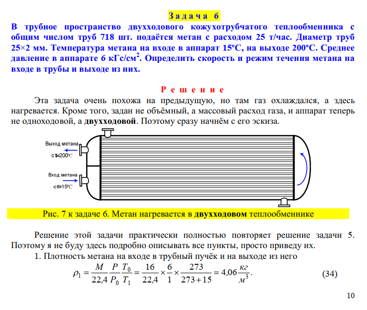 В трубное пространство двухходового кожухотрубчатого теплообменника с общим числом труб 718 шт. подаётся метан с расходом 25 т/час. Диаметр труб 25×2 мм. Температура метана на входе в аппарат 15ºС, на выходе 200ºС. Среднее давление в аппарате 6 кГс/см2. Определить скорость и режим течения метана на входе в трубы и выходе из них