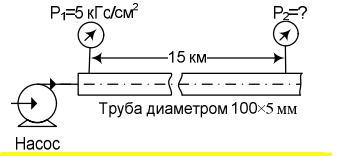 По трубопроводу длиной 15 км и диаметром 100×5 мм перекачивается бензол с расходом 10 т/час при средней температуре 20 0 С. Стенки трубопровода гладкие. Манометр, установленный в начале, показывает давление 5 ат. Определить показание манометра, установленного в конце трубопровода..