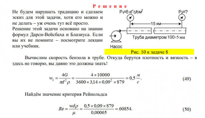 По трубопроводу длиной 15 км и диаметром 100×5 мм перекачивается бензол с расходом 10 т/час при средней температуре 200С. Стенки трубопровода гладкие. Манометр, установленный в начале, показывает давление 5 ат. Определить показание манометра, установленно