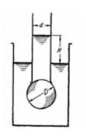 Задача (Куколевский И.И.) 3-24. Погруженный в воду полый шаровой клапан диаметром D = 150 мм и массой m = 0,5кг закрывает выходное отверстие внутренней трубы диаметром d =100мм. При какой разности уровней Н клапан начнет пропускать воду из внутренней трубы в резервуар?