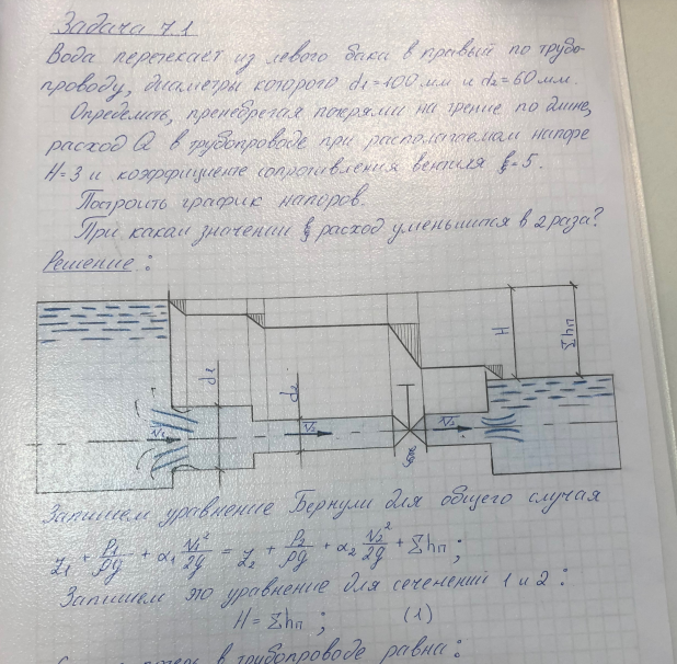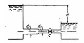 Задача (Куколевский И.И.) 7-1. Вода перетекает из левого бака в правый по трубопроводу с диаметрами d1 = 100 мм и d2=60 мм. Определить, пренебрегая потерями трения, расход в трубопроводе при напоре H = 3 м и коэффициенте сопротивления вентиля ?. Построить график напоров. При каком значении ? расход уменьшится в два раза?