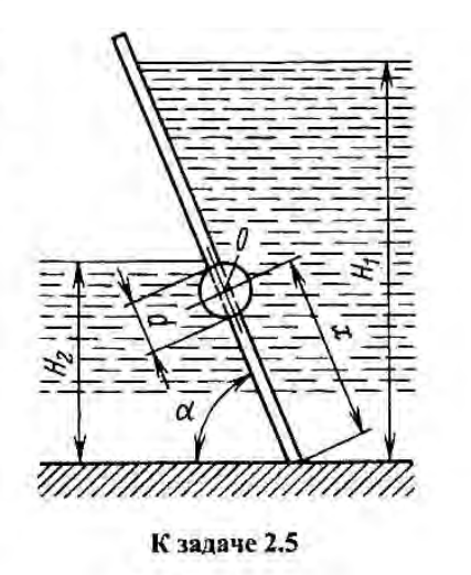 Щитовой затвор должен автоматически опрокидываться для пропуска воды при уровне последней Н 1 >6 м. Щит поворачивается на цапфах О диаметром d =0,4 м, имеющих коэффициент трения f = 0,2. Ширина щита B = 8 м, его угол наклона а = 60°. Найти, на каком расстоянии х должна быть расположена ось попорота щита, если под щитом имеется постоянный уровень воды H 2  = 3 м, и определить силу Р, воспринимаемую его опорами в момент опрокидывания. Ответ, х = 2,69 м; Р = 1220 кН.