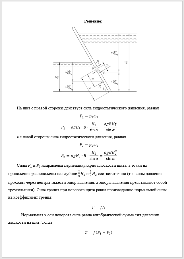 Щитовой затвор должен автоматически опрокидываться для пропуска воды при уровне последней Н1>6 м. Щит поворачивается на цапфах О диаметром d =0,4 м, имеющих коэффициент трения f = 0,2. Ширина щита B = 8 м, его угол наклона а = 60°. Найти, на каком расстоянии х должна быть расположена ось попорота щита, если под щитом имеется постоянный уровень воды H2 = 3 м, и определить силу Р, воспринимаемую его опорами в момент опрокидывания.