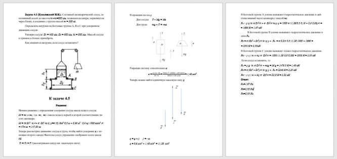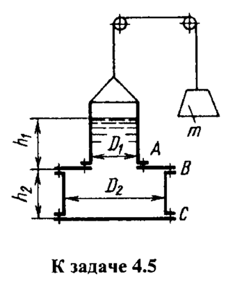 Составной цилиндрический сосуд, заполненный водой до высоты h 1+h 2=800 мм, подвешен на шнуре, перекинутом через блоки, и соединен с грузом массой m = 200 кг.  Определить нагрузки на болтовые группы А, В и С при ускоренном движении сосуда.  Размеры сосуда: D 1 = 400 мм, D 2 = 600 мм, h 2 = 300 мм. Массой сосуда и трением в блоках пренебречь. Как изменятся нагрузки, если сосуд остановить? Ответ:   РА= 1,67 кН; РВ = PС= 2,56 кН..