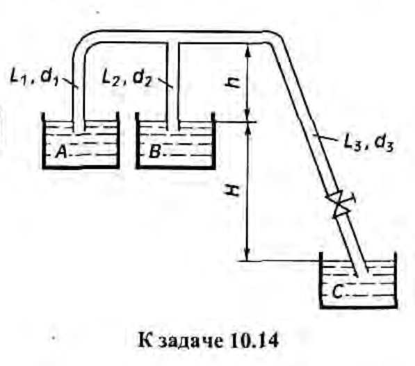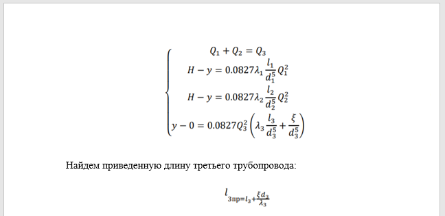 Длина горизонтального участка трубы 3 равна 160 м, высота его расположения над уровнями ℎ = 4 м. Принять 𝜆1 = 𝜆3 = 0.02 и 𝜆2 = 0.025.