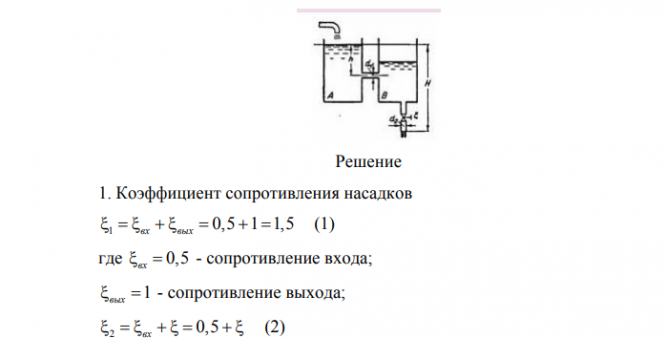 Из бака А, в котором поддерживается постоянный уровень, вода протекает по цилиндрическому насадку диаметром d1 = 20 мм в бак В, из которого сливается в атмосферу по короткой трубке диаметром d2 = 25 мм. Напор H = 900 мм, а ось патрубка размещена на глубине h = 400 мм под уровнем воды в баке А. Найти зависимость расхода воды, перетекающей из бака A в бак В, от коэффициента сопротивления ? крана, установленного в трубке. Определить наименьшее значение ?, начиная с которого дальнейшее увеличение открытия крана (т. е. уменьшение его ?) не будет давать увеличения расхода. Потери на трение в трубке не учитывать.