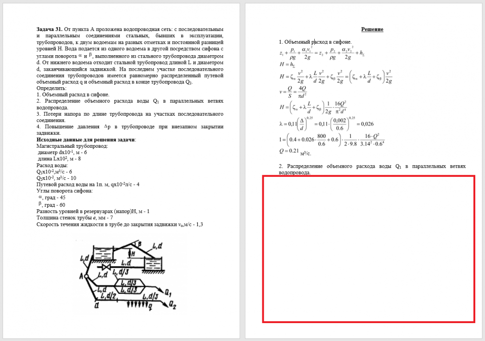 Объемный расход в сифоне. 2. Распределение объемного расхода воды Q1 в параллельных ветвях водопровода. 3. Потери напора по длине трубопровода на участках последовательного соединения. 4. Повышение давления р в трубопроводе при внезапном закрытии задвижки. Исходные данные для решения задачи: Магистральный трубопровод:  диаметр dх10-1, м - 6  длина Lх102, м - 8 Расход воды: Q1х10-23/с - 6 Q2х10-2, м3/с - 10 Путевой расход воды на 1п. м, qх10-2л/с - 4 Углы поворота сифона:   , град - 45   , град - 60 Разность уровней в резервуарах (напор)Н, м - 1 Толщина стенок трубы е, мм - 7 Скорость течения жидкости в трубе до закрытия задвижки vо,м/с - 1,3 .