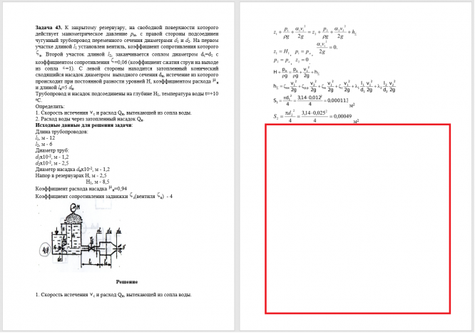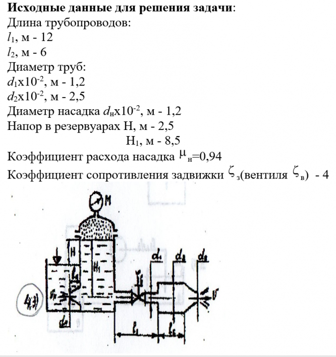 Трубопровод и насадок подсоединены на глубине Н1, температура воды t=+10 оС. Определить: 1. Скорость истечения с и расход Qн, вытекающей из сопла воды. 2. Расход воды через затопленный насадок Qн. Исходные данные для решения задачи: Длина трубопроводов: l1, м - 12 l2, м - 6 Диаметр труб: d1х10-2, м - 1,2 d2х10-2, м - 2,5 Диаметр насадка dнх10-2, м - 1,2 Напор в резервуарах Н, м - 2,5                                      Н1, м - 8,5 Коэффициент расхода насадка н=0,94 Коэффициент сопротивления задвижки з(вентиля в)  - 4 .